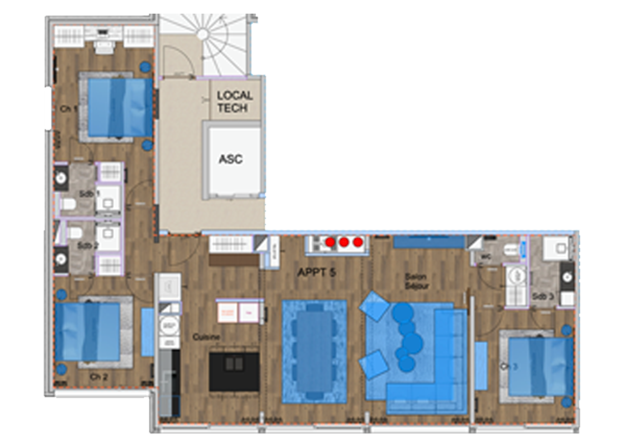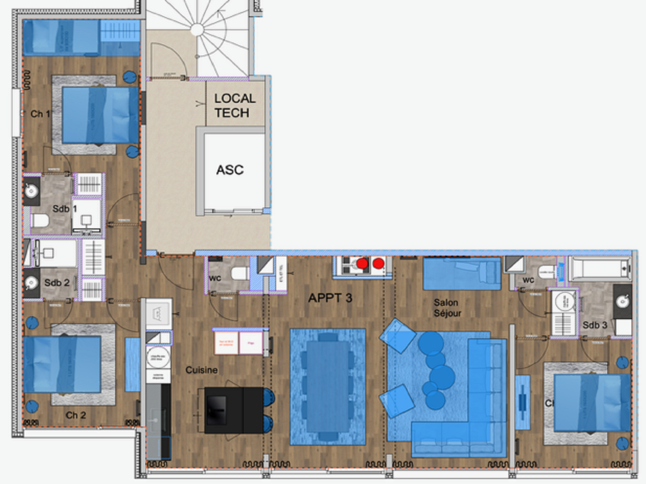 - APPARTEMENT 2 : 140 m2, 4 chambres, 10 couchages, 3 salles d’eau, 2 grandes terrasses Sud et Est, sauna privatif.